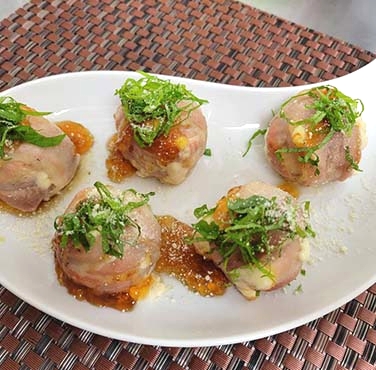 トマトにブタのバラ肉を巻いて焼き、オリジナルのタレをかけています。